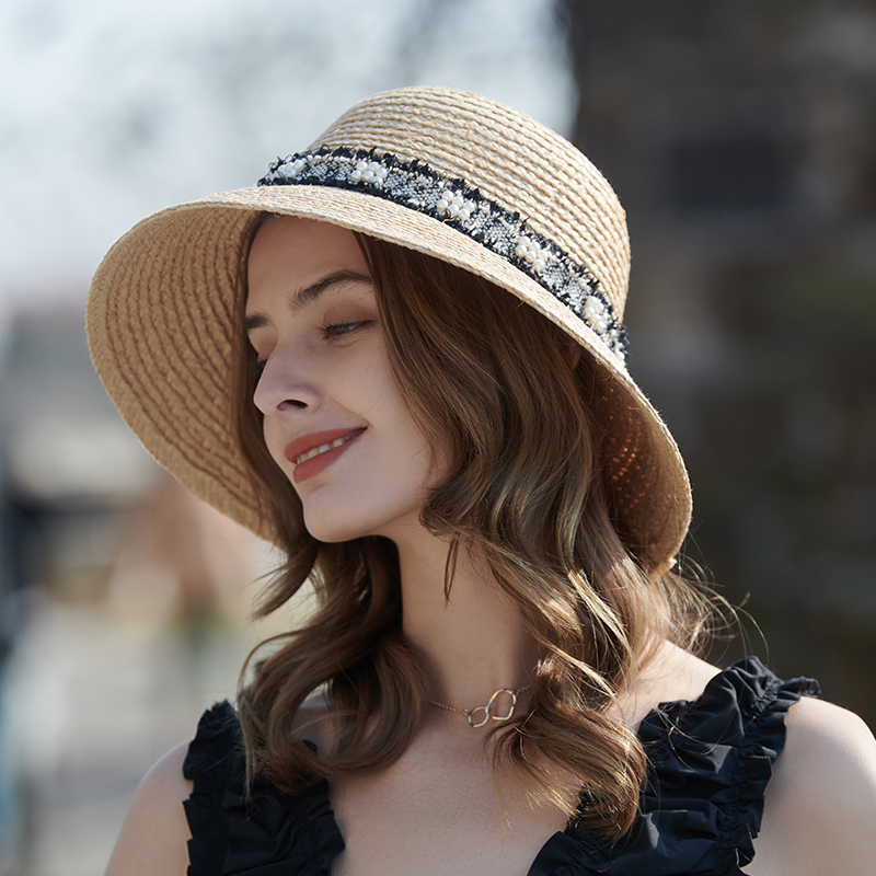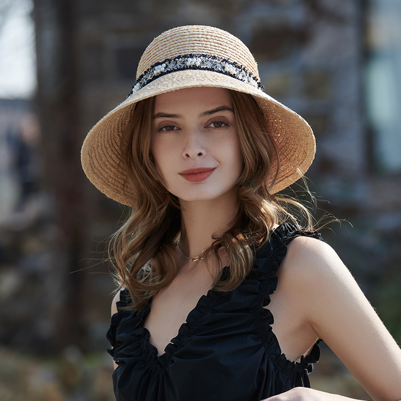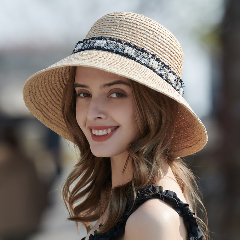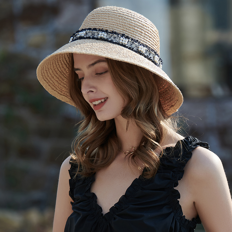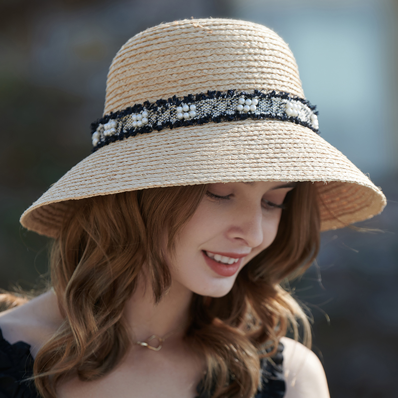 | 姓名 | 进口拉菲草手工编织渔夫帽,配有小香珍珠和生边织带,增添帽子风格 |